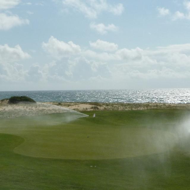Nous nous dirigeons ensuite vers les trous 13, 14 et 15, construits le long d’une magni­fique plage de sable sauvage qui s’étend à perte de vue. Les trous se dé­ploient au milieu des dunes. Le ciel s’est légèrement couvert, et le vent souffle beaucoup plus qu’à l’intérieur. Philippe, le fontainier, met en route l’arrosage avec sa télé­commande.